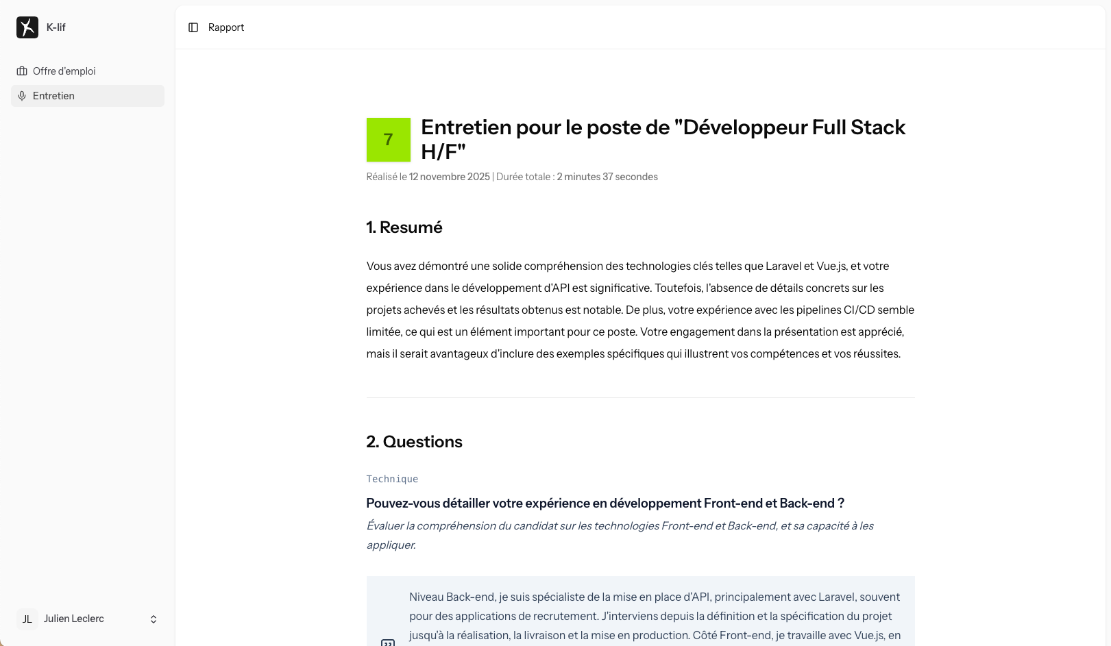 Le rapport analyse la structure de vos réponses, leur clarté, leur pertinence par rapport aux questions posées. C'est un feedback actionnable pour progresser rapidement.